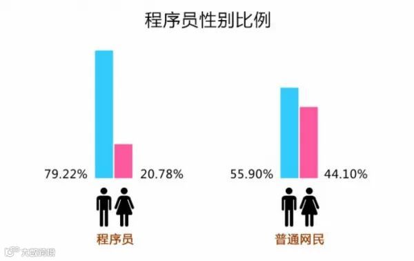 在中国,男程序员占了绝大多数,达到了近80%,只有20%左右的女性从事程序员的工作。程序员这个行业还是有很明显的性别差异。这与程序员的工作特点有很大的关系(工作时间长,加班多,生活不规律等)。程序员的性别比例与普通网民的性别比例形成了鲜明的对比:普通网民的男女比例基本相同,与自然人口的男女比例基本一致。这说明,互联网真正做到了男女平等,没有性别歧视。而程序员这个职业,基本上是男人的天下。