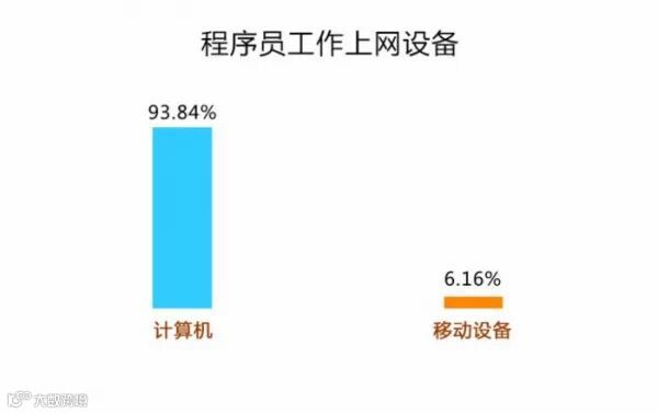 绝大多数程序员的工作上网设备为计算机,这与程序员的工作内容对设备的要求有关。只有6%左右的程序员在工作时用移动设备上网,不过,这一般不是在做开发和写代码的时候,而是利用碎片时间,用移动设备浏览代码或查找资源。