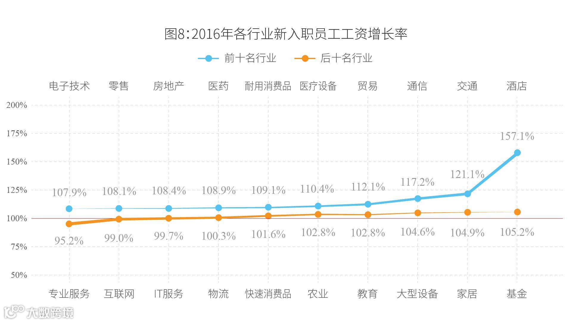 分行业的新入职员工工资上涨情况如图8所示。图8中,我们选择了招聘人数最多的30大行业,并列出其中工资增速较快的十大行业与较慢的十大行业。可以发现,从2010年左右开始大放异彩的互联网、IT服务行业在2016年的工资增速出现了显著下降,工资的绝对水平甚至也开始下降;与电商相关的物流行业工资也出现了停滞。