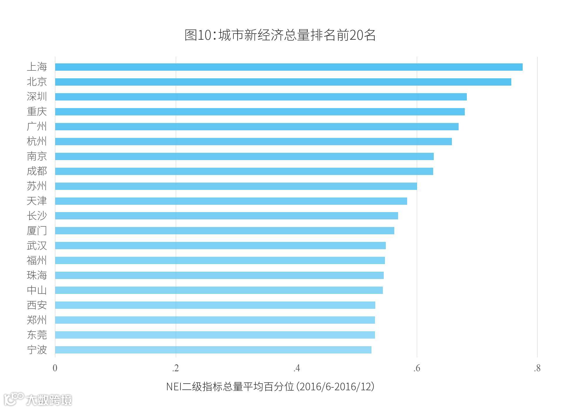 2016年12月新经济总量指数城市排名前20名如图10所示,上海、北京、深圳、重庆与广州排名前五,该排序计算每个投入指标在所有城市中的排序百分位,再将百分位加权平均,体现的是近半年城市间新经济总量排名。