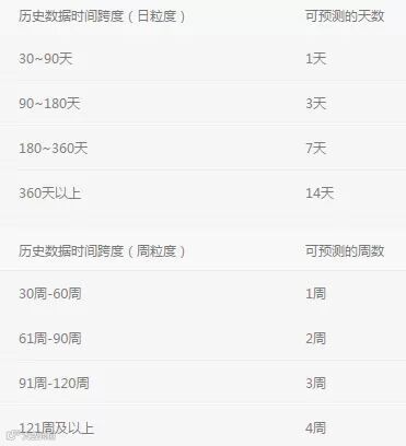 上传的历史数据的时间跨度不同,可预测的时间不同;历史数据越多,可预测的时间越长。 历史数据时间跨度和可预测时长的对应关系如下: