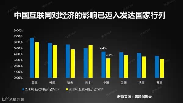中国的互联网催生了活跃的信息、通信和技术产业、繁荣的社交网络以及全球最大的网络零售市场。通过互联网产生的经济,在中国GDP中的占比已从2010年的3.3%增加到2013年的4.4%。这一数据成功超越美国,中国也由此进入“互联网发达国家行列”。