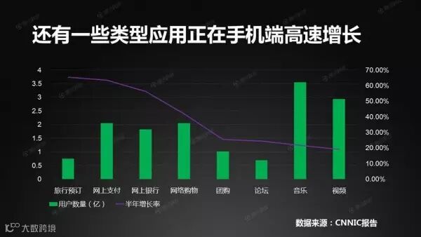 除上述应用,还有一些应用虽然覆盖率不高,但正在手机端高速增长,其中手机旅行预订、手机支付、手机银行的增速最快。