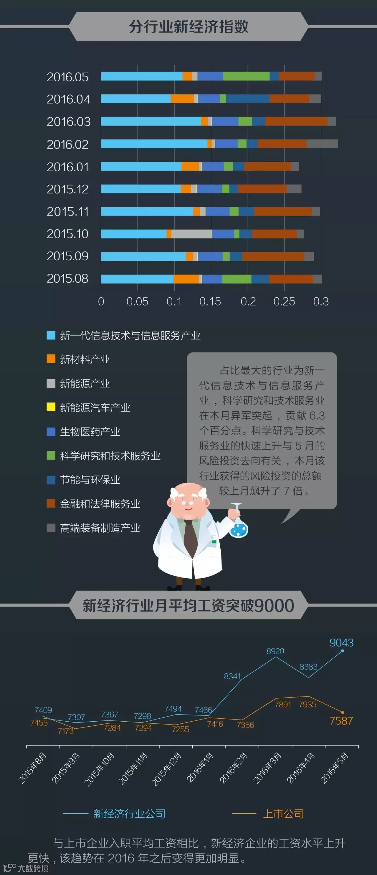 2016年5月,财智BBD中国新经济指数(NEI)为30.1,即新经济占整个经济中的比重为30.1%。该值较4月的30.0微升0.1个百分点,与2015年8月的第三高值持平(图1)。NEI所含行业详见第二部分的讨论和《财智BBD中国新经济指数技术报告》。