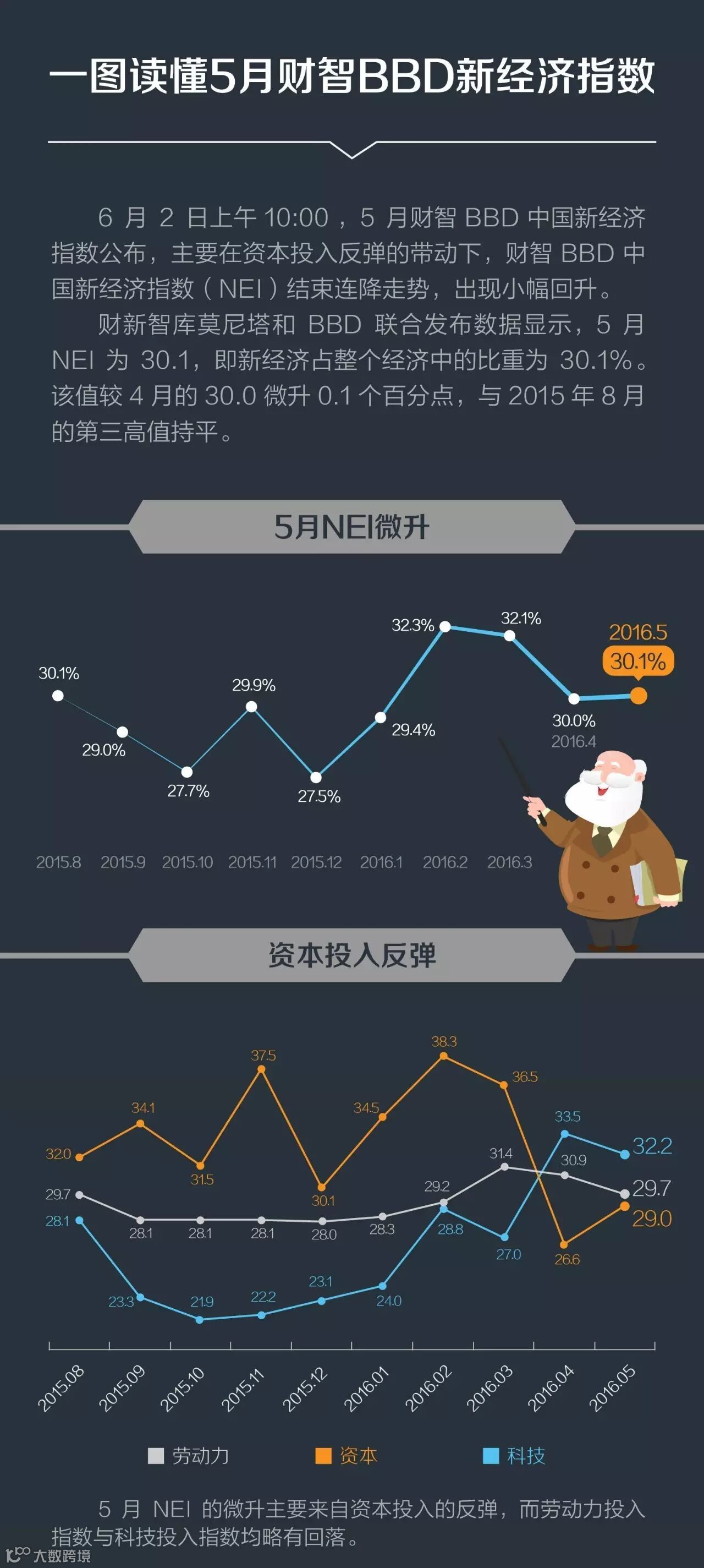 6月2日上午 10:00 ,5月财智 BBD 中国新经济指数(NEI)公布,主要在资本投入反弹的带动下,财智BBD中国新经济指数结束连降走势,出现小幅回升。