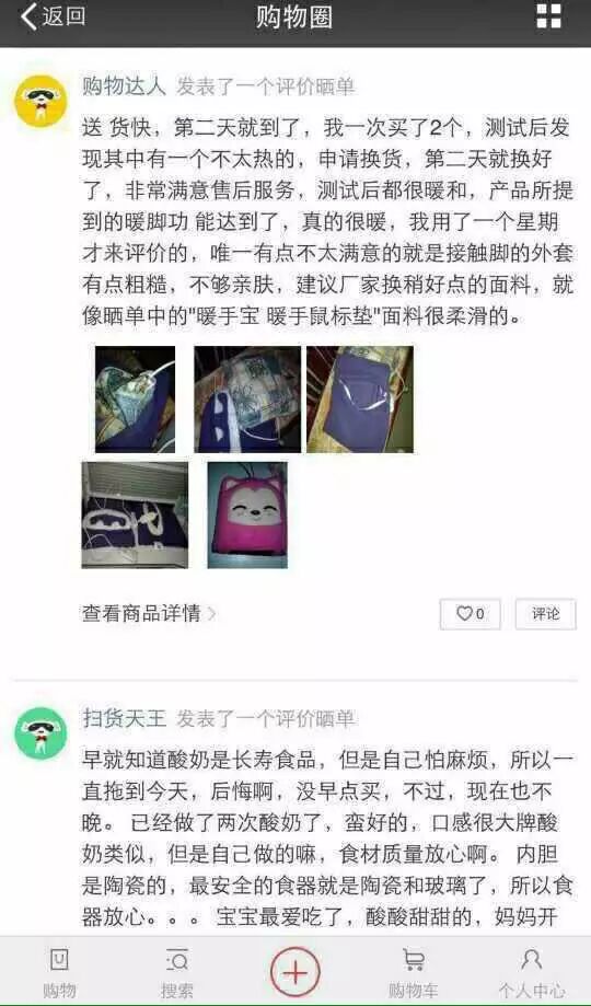 购物圈绝对是又一款颠覆朋友圈营销的功能,特别是对于现在正火爆的微商。为什么?因为目前所知购物圈的大概功能就是微信购物朋友圈,一旦完全实施以后每个人都有两个朋友圈,一个和朋友沟通,一个专门看微商发的信息,即购物分享,也就是专门一个广告圈。目前正在灰度内测中,大概样式如下: