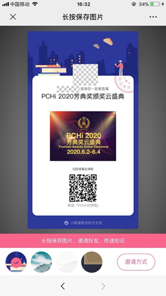 活动说明:点击左下角的“阅读原文”,进入直播间,生成自己独有的云盛典海报图片,将图片发到微信朋友圈,随配文字:“6月2-4日,PCHi2020芳典奖云盛典,扫描图片二维码进入直播间,我在这里,等你来!”我们将统计通过您分享的朋友圈进入直播间的人数,邀请达人榜前20名的观众将收到我们的精美礼品!