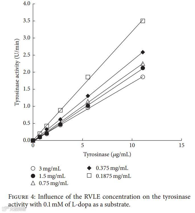 酪氨酸酶的活性与酪氨酸酶的浓度呈现一个线性关系,随着RVLE的增加其酪氨酸酶的活性降低。这就可以证明RVLE具有抑制酪氨酸酶而达到美白的功效。
