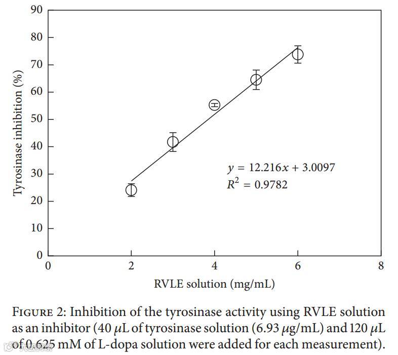 随着曲酸的增加,其抑制酪氨酸酶的功能增强。曲酸的IC50为0.014mg/mL。抑制酪氨酸酶活性的提取物为Vitis vinifera L.(提取其葡萄干的干茎)。虽然RVLE的效果并没有曲酸更好,但是依然会认为作为一种天然来源,可以安全的用在化妆品的产品中。