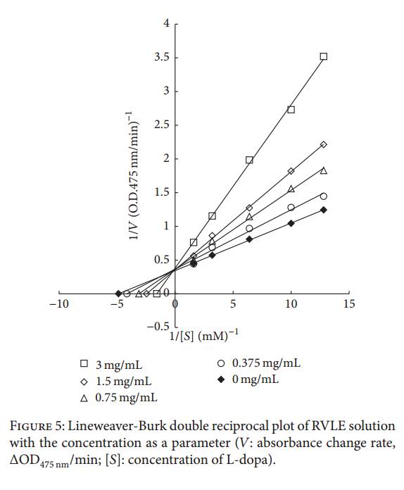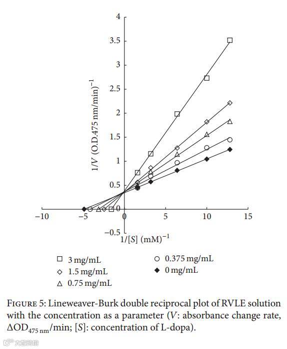 因此我们RVLE对酪氨酸酶的结合是通过影响其对L-多巴的结合。RVLE和L-多巴于酪氨酸酶的结合是在同一个位点。如图5所示,RVLE的抑制效应为竞争性抑制。