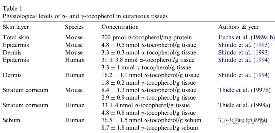 和其他的组织一样,α-生育酚和γ生育酚,也均存在于小鼠和人类的表皮、真皮和角质层中。人真皮和表皮中α-生育酚/γ-生育酚的物质的量为10:1。