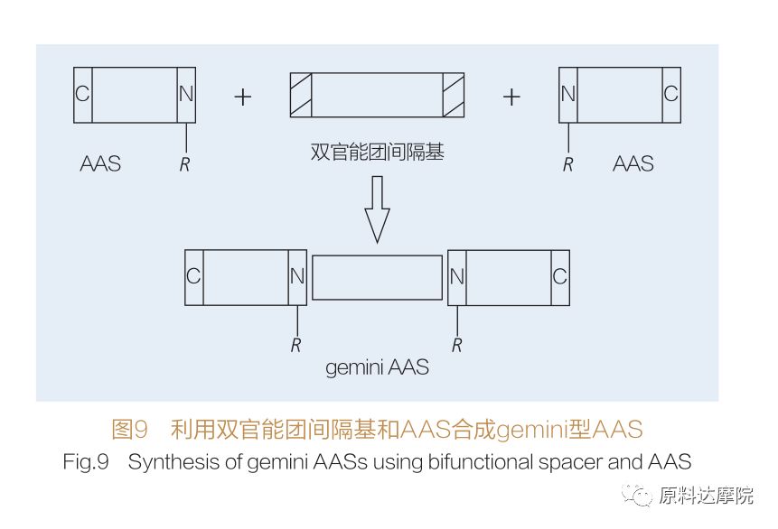 最早是Valivety等率先开发gemini脂氨基酸(lipoamino acid)的酶催化合成。Yoshimura等研究了一种基于胱氨酸和n-烷基溴的基于氨基酸的gemini表面活性剂的合成、吸附和聚集。将所合成的表面活性剂与相应的单体表面活性剂进行了比较。Faustino等描述了以L-胱氨酸、D-胱氨酸、DL-胱氨酸、L-半胱氨酸、L-蛋氨酸和L-磺基丙氨酸为基础的阴离子型基于尿素的单体AAS及其对的gemini的合成,并用电导、平衡表面张力和稳态荧光的手段对其进行表征。研究表明,通过比较单体和gemini,gemini的cmc值较低。