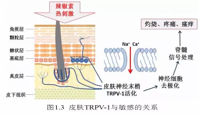② 香草酸亚型瞬时受体电位1通道蛋白(Transientreceptorpotentialvanilloid1,TRPV-1):表达于成纤维细胞、角化细胞、黑素细胞及肥大细胞等,引起炎症性疼痛,减缓屏障修复,接受毒性、高温和酸性等伤害性刺激后被激活,从而产生瘙痒、灼热或疼痛等敏感症状。