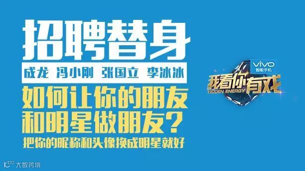 前段时间,某手机为其冠名的《我看你有戏》进行了一次朋友圈营销实验:招募成龙、李冰冰等四大导师的“替身”,有应聘愿意参与互动的网友,则邀请其以“明星替身”的身份入驻朋友圈——具体活动规则其实很简单,在节目播出期间,将头像和昵称改为明星导师,并以导师的名义对节目进行趣味点评,以及与自己的粉丝进行互动。于是一夜之间,《我看你有戏》四大明星导师空降在很多人的朋友圈当中。“看”节目,变成了“玩儿节目”。