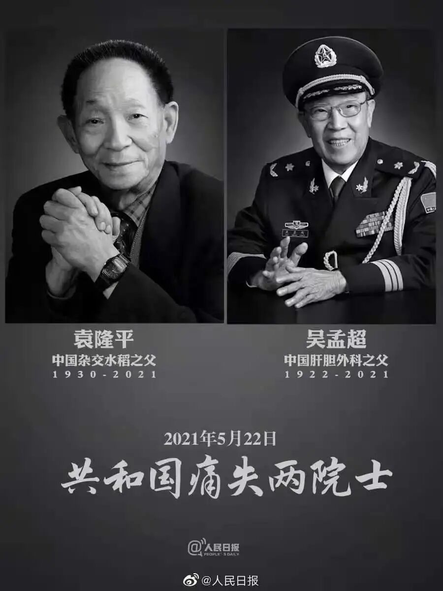 5月22日13时02分,“中国肝胆外科之父"吴孟超逝世,享年99岁。13时07分,"杂交水稻之父"袁隆平,因多器官功能衰竭在长沙逝世,享年91岁。