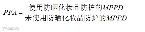 PFA值的定义:引起被防晒化妆品防护的皮肤产生黑化所需的 MPPD 与未被防护的皮肤产生黑化所需的 MPPD 之比,即: