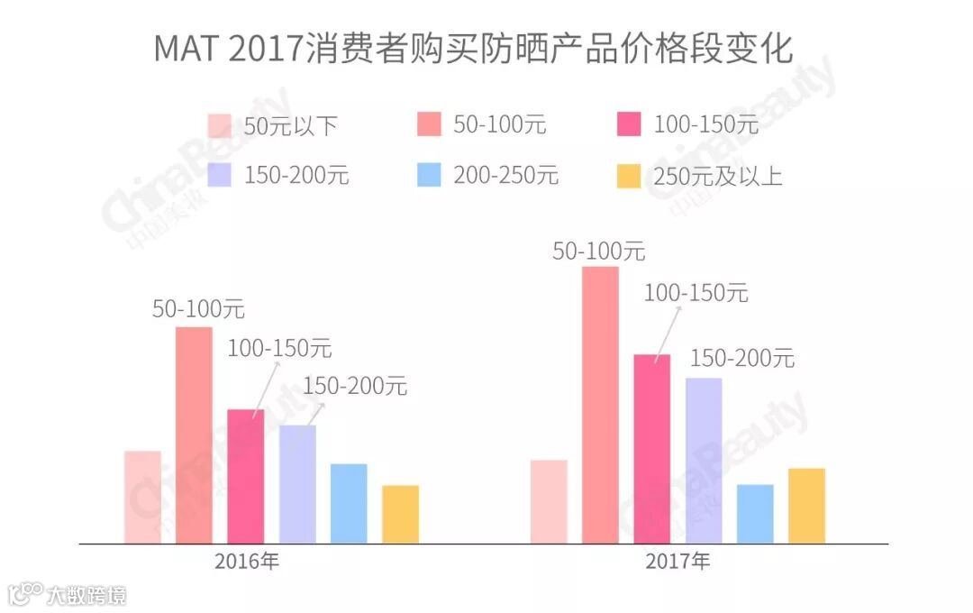 相较于2016年,2017年大众、中档与高档三个层级的消费者人数均有所增加。而在防晒产品价格段上,2017年同比2016年主流价格段仍然集中在50-200元,其中50-100元消费人数大大增加。