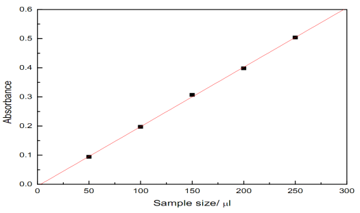 图3 醇提过柱无患子皂苷进样量与吸光度关系