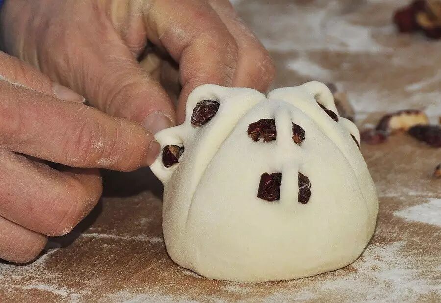 用两手的小手指在揉好的饽饽面坯上掏出插枣的鼻儿,数量根据需要自定,但要前后左右对称。然后将去核的枣肉切成细条状,每个鼻儿里塞入一片。也有整颗大枣不切就用的。