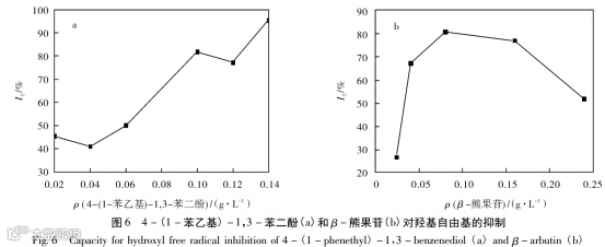 4-(1-苯乙基)-1,3-苯二酚和β-熊果苷的质量浓度对羟基自由基抑制率的影响如图6所示。由图6可知,4-( 1-苯乙基)-1,3-苯二酚和β-熊果苷的EC50分别为0.06和0.033g/L。4-( 1-苯乙基)-1,3-苯二酚随质量浓度的增加对羟基自由基的抑制率基本呈上升趋势。