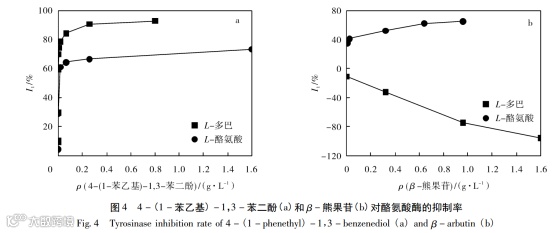 由图4a可知,4-(1-苯乙基)-1,3-苯二酚对L-多巴和L-酪氨酸的半抑制浓度( IC50 )分别为8.598×10-5和0.0105g /L。