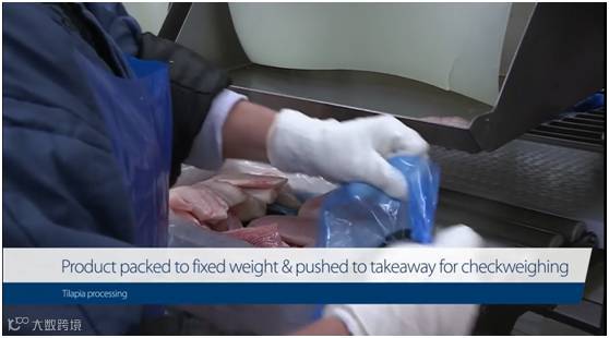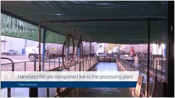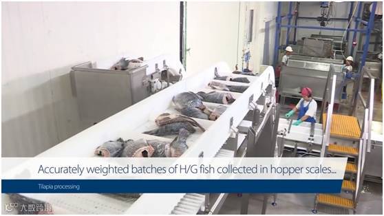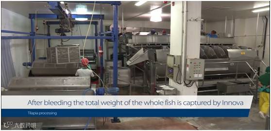 在将罗非鱼送至切边作业线之前,对鱼肉进行冷却泡药和清洗且将小批次鱼肉分发至各个切鱼片机。