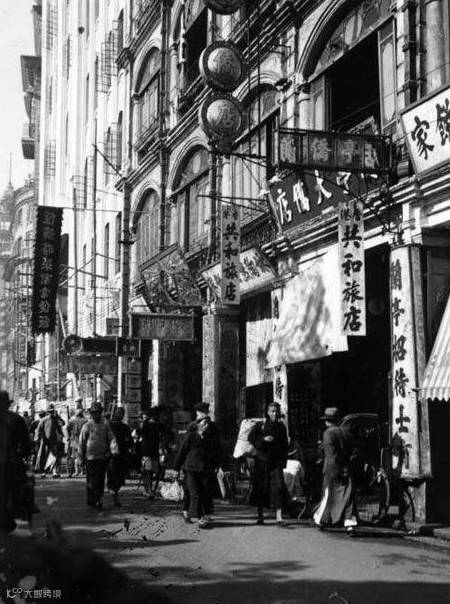 6/10 图为1932年的上海金陵东路,大街两旁开满了店铺。