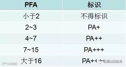 其他情况的话规定:长波紫外线(UVA)防护效果的标识应当以PFA值的实际测定结果为依据,在产品标签上标识UVA防护等级PA。
