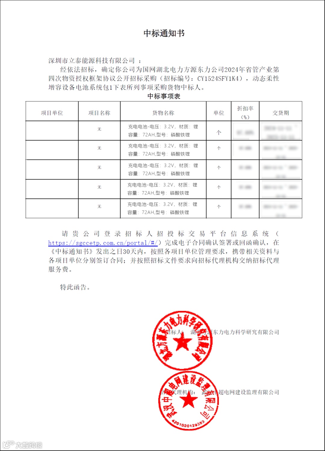 恭喜深圳市立泰能源科技有限公司在2024年国网湖北电力方源东力公司省管产业物资授权框架协议公开招标采购中成功中标。这次中标不仅标志着我们公司产品的实力得到了广泛认可,也意味着立泰能源正式入围国网电力采购白名单。