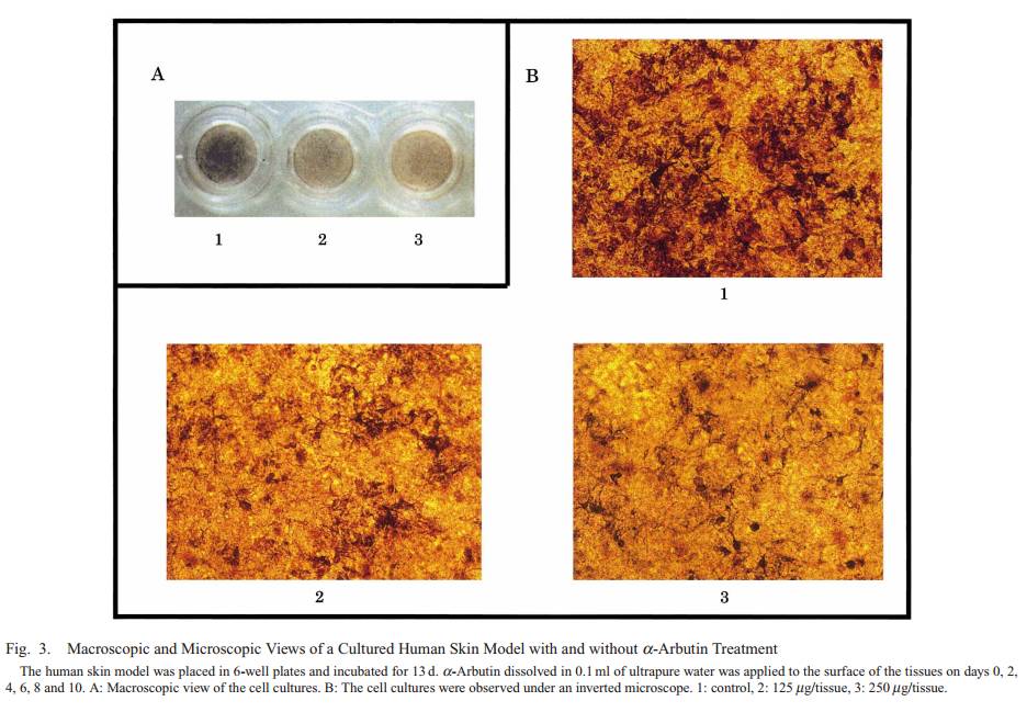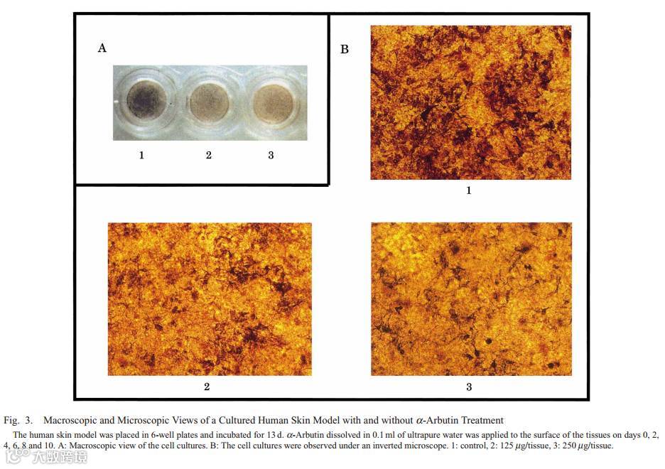 类似地,Sugimoto等利用MelanoDerm皮肤模型(含黑素细胞) 通过量化模型表面颜色的变化和黑素生成量,发现α-熊果苷可有效抑制黑素合成而对模型细胞活性无明显影响。(图片点击可放大)