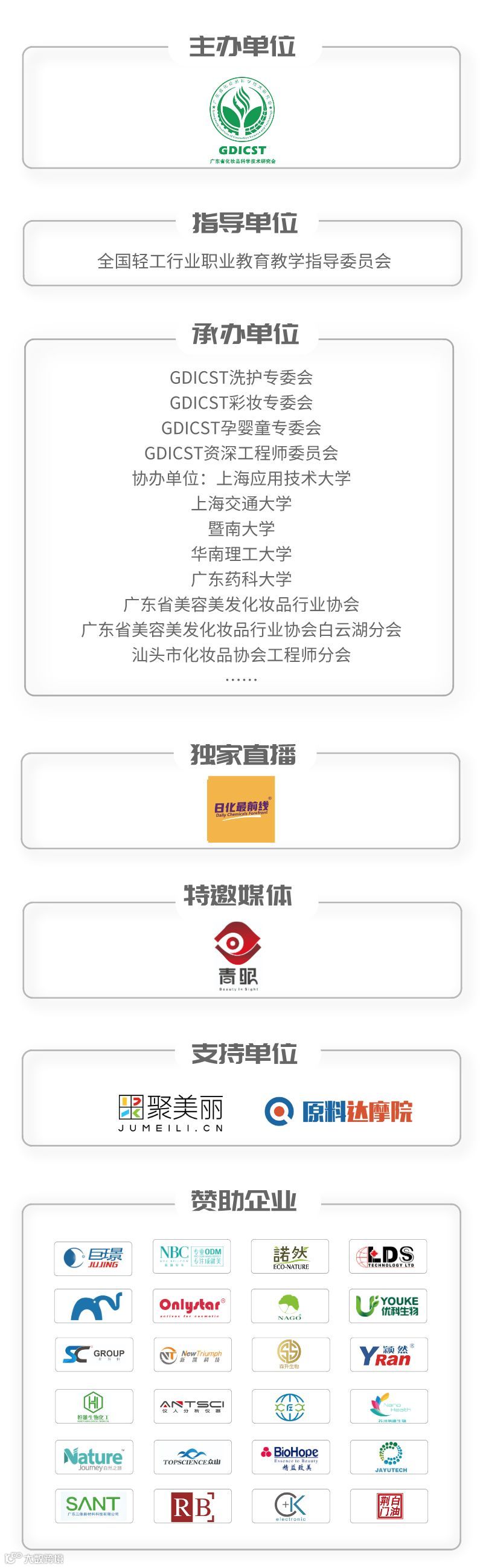12月7日-8日,由广东省化妆品科学技术研究会(以下简称GDICST)主办、全国轻工行业职业教育教学指导委员会指导、上海应用技术大学、上海交通大学、暨南大学、华南理工大学、广东药科大学、广东省美容美发行业协会、汕头市化妆品协会工程师分会协办的,日化最前线独家直播,青眼、聚美丽等为特邀媒体,找原料网为支持单位的2019(第四届)中国化妆品科技节即将在广州颐和大酒店隆重举行。本次大会以“新时代新发展,新科技新人才”为主题,内容专业充实,包含中国化妆品产学研对接大会暨高校前沿创新论坛、2019(第二届)化妆品配方师知识竞赛暨化妆品工程师成长论坛、中国十大创新原料/最具创新科研团队等系列创新评选以及多个主题方向论坛等活动。