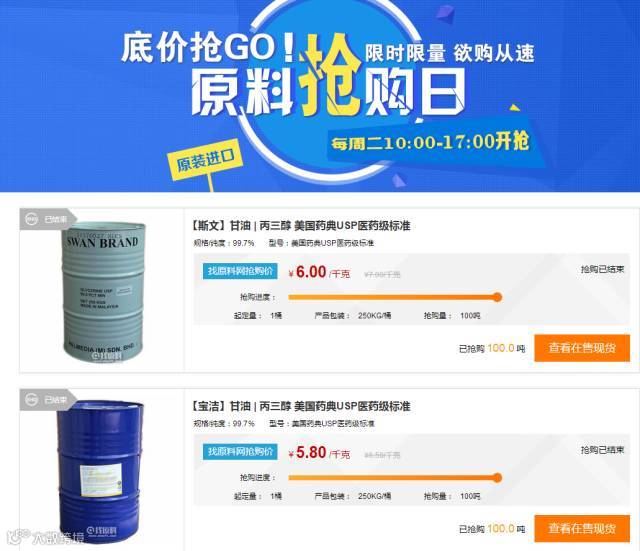 还记得上期的甘油抢购:不到30分钟,马来西亚斯文甘油的下单量就超过20吨,而宝洁甘油也达到15吨!至抢购结束仍有不少用户咨询(手慢的小心会错过哦~!)