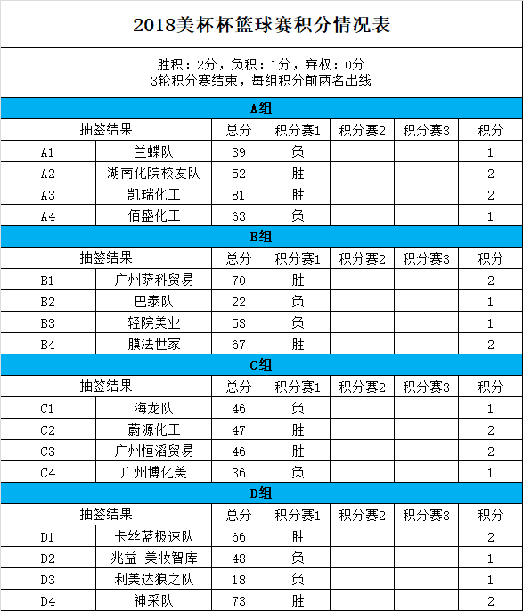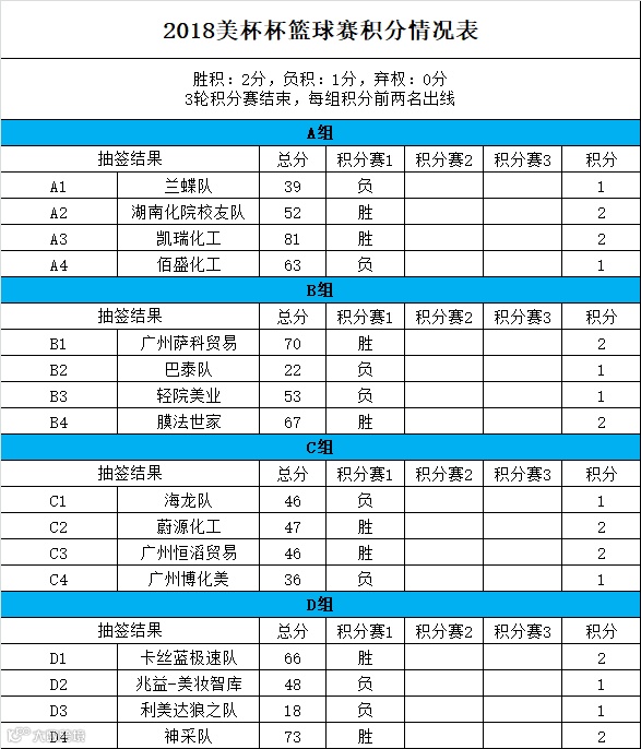 1、比赛采取小组赛加淘汰赛的形式举行,根据参赛队伍数量分成若干小组,组内每个队伍一一对决,获胜的队伍计2分,输的队伍计1分,弃权计0分,每个小组成绩最好的两支队伍进入下一轮淘汰赛(成绩相同则计算净胜分)。每个参赛队伍需由领队进行抽签,决定各自队伍的分组。