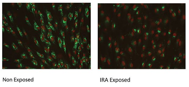 最近,进行了体外研究以测量该提出的防御效果和由IR诱导的皮肤上的自由基水平。使用含有(或不含)上述抗氧化剂或可见/ IR反射器组分的标准SPF配方用于皮肤活组织检查。正如预期的那样,结果表明使用包含IR抗氧化剂复合物和IR物理反射器的配方(下图)实现了针对IR损伤的最佳皮肤防御。