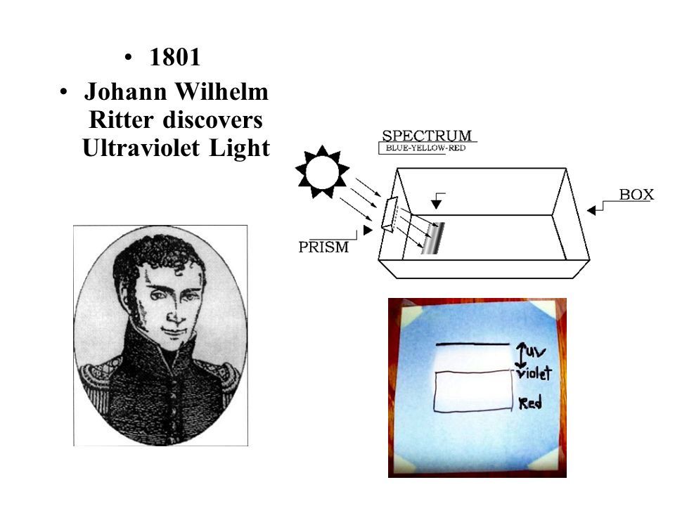 一年之后,里特受到了赫歇尔发现的启发,看看光谱的紫色端是否有光。结果,里特发现了紫外线。他称之为“化学射线”——诱导某些化学反应的不可见光线。这些表现与可见紫光相似,但在光谱中超出了它们。它们后来被改名为紫外线辐射。