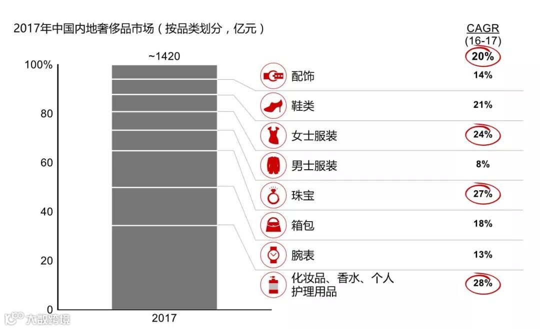 贝恩咨询(Bain & Co.)刚刚发布的《2017年中国奢侈品市场研究》报告显示,2017年中国内地奢侈品市场的增速达到了20%,超过海外奢侈品市场的整体增速。