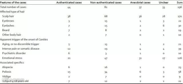 而在196个案例中,126例与经历精神压力有关。而前面讲到的Alopecia,总共只有只有23例(Authenticated cases 6例,non-authenticated Cases有16例,传闻中有1例)