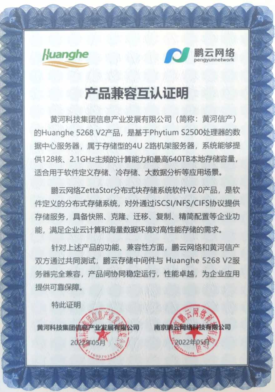 近日,南京鹏云网络科技有限公司(以下简称:鹏云网络)ZettaStor DBS分布式块存储系统与黄河科技集团信息产业发展有限公司(以下简称:黄河信产)旗下四款产品完成产品兼容互认证。