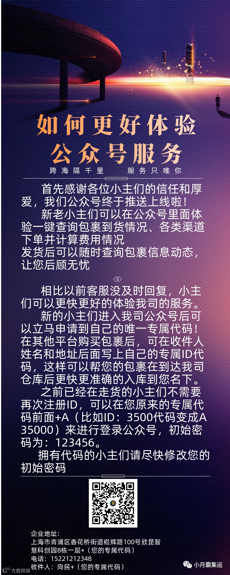 为了更方便的服务小主们,我司已经开通微信公众号!各位小主们可以往下浏览进入公众号后如何操作,体验更好更快的集运服务。