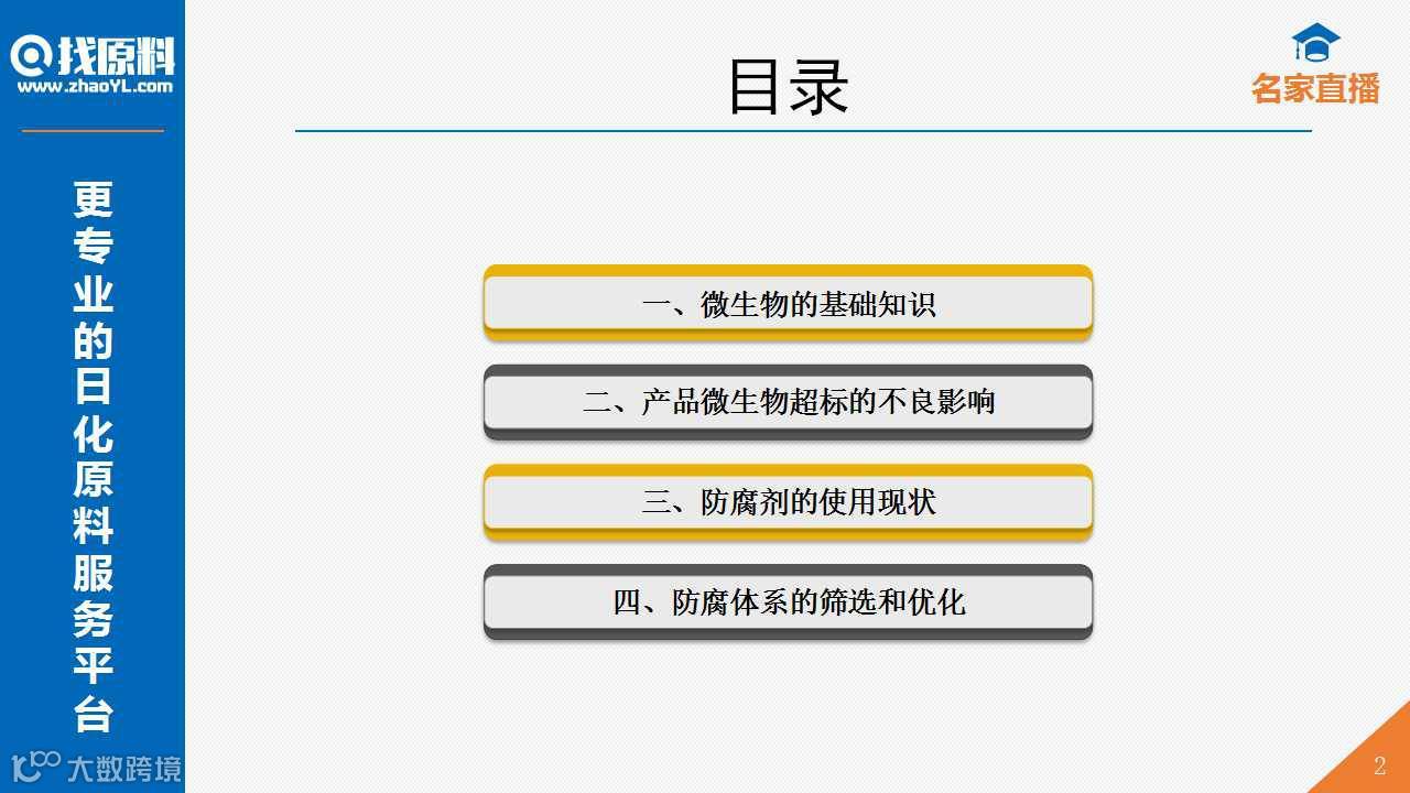今天交流的题目是化妆品与微生物(配方研发阶段),重点在于交流一下思路,而不是具体的防腐体系和相应的法规。内容分四部分,第一部分:微生物的基础知识;第二部分:产品微生物超标的不良影响;第三部分:防腐剂的使用现状;第四部分:防腐体系筛选和优化。