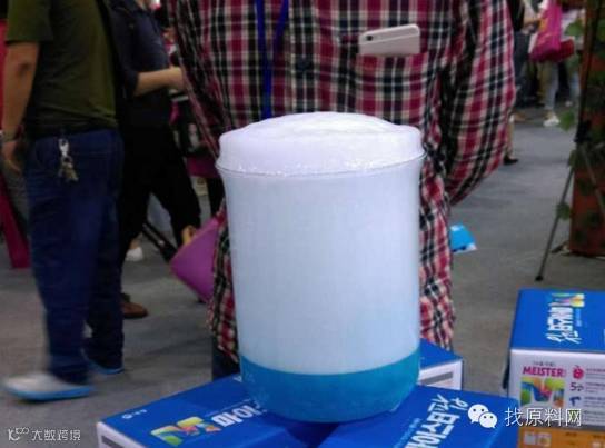 从展台工作人员的演示看到,将洗衣果投放到装有水的杯子中,杯子里出现便开始产生泡泡,如下图所示: