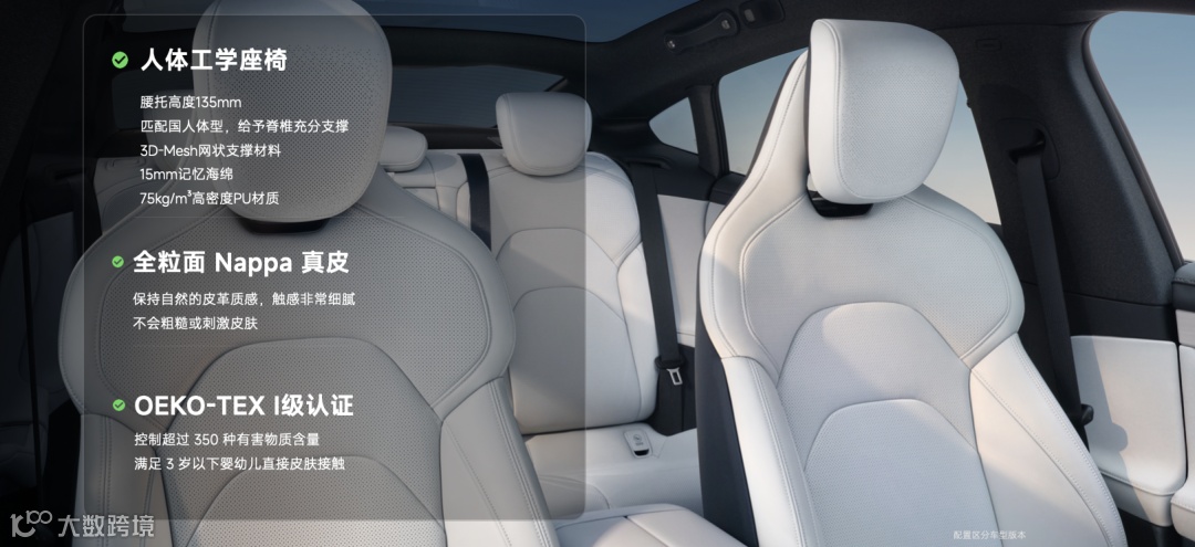 小米SU7 采用环绕式座舱设计,C 级乘坐空间,前后排都不会感觉压抑。座椅是一体式运动风格,填充高密度发泡和记忆海绵,还选配了全粒面 Nappa 真皮,手感柔软舒适、健康环保。