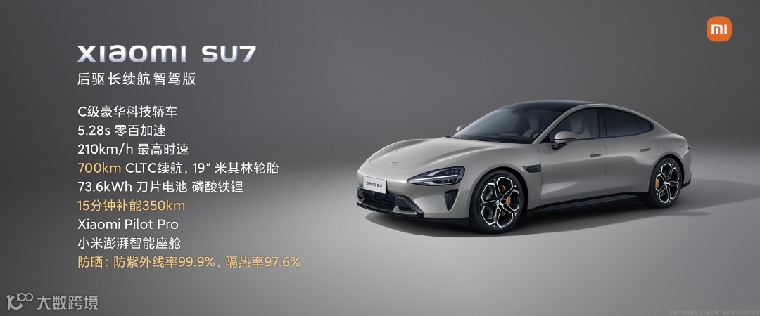 小米SU7 是一款 C 级豪华科技轿车,有着黄金比例的轮轴比、轮高比、宽高比。侧面,轮廓线优雅;正面,低趴的姿态冲击力十足;正侧方,流畅饱满的车身曲线与极具张力的前轮包设计完美协调;尾部,别具一格的小翘尾和光环尾灯设计,极具辨识度。
