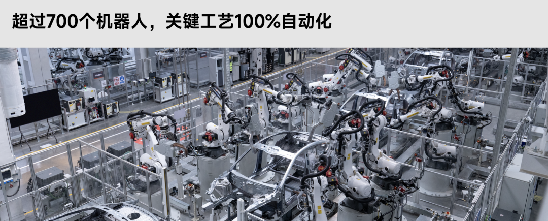 小米汽车工厂的自动化程度非常高,整个工厂有超过 700 个机器人,实现了关键工艺的 100% 自动化。