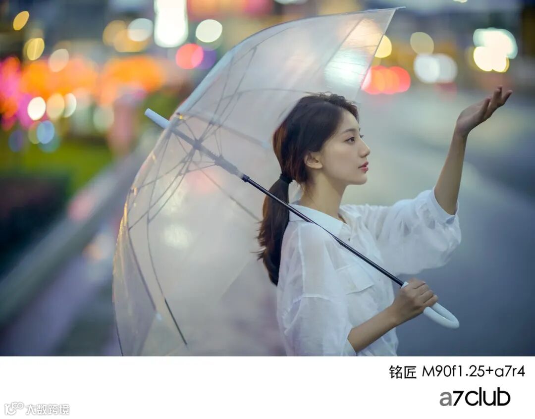 傍晚,天空深沉的蓝调把周围的环境都染成了蓝色,透过雨伞拍摄模特的特写,雨伞上的雨滴被虚化成无数的小圆,此时我们可以配合整个环境色温使用较为偏冷的白平衡进行拍摄,雨夜的路边灯光特别好看,在1.25的光圈加持下,焦外的光斑唯美舒服,虽然灯光不规则,但画面也中并没有出现明显的鬼影,画面保持着干净自然。