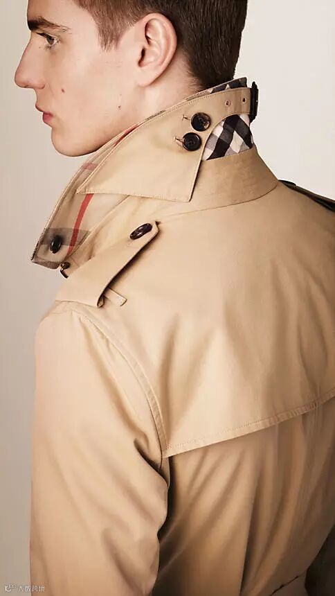 雨罩:现如今多数风衣款式中都有背部雨罩这一经典设计。它位于背部上方的襟翼,可让雨水从外套的背部滑落。从防水效果来看,科技型的面料更具有透气又防水的效果,比如Burberry 先生所创造的Gabardine面料。