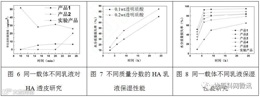 透明质酸乳液保湿性能测试:将恒温恒湿箱设定为28℃和湿度40%下,稳定半天,将相同面积大小的培养皿在电子天平上称重量得M1,分别称取乳液(不同质量百分比的HA)均匀涂抹在培养皿中,称重量得M2,将培养皿(不封口)放入稳定的恒温恒湿箱,隔一定的时间取出培养皿(封口),称重量得M3,该方法称为体外称量法,水分损失率按公式:水分损失率(%)=(M2-M3)/(M2-M1)*100计算,并与其他类似产品进行保湿性能研究。