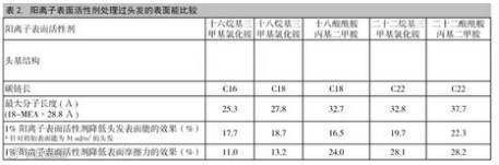 阳离子表面活性剂有许多种类,包括含双链烷基以及酯基结构的。本文只对不同烷基链长的三甲基氯化铵和(用酸中和的)酰胺丙基二甲胺类阳离子表面活性剂进行比较,包括十六烷基三甲基氯化铵﹑十八烷基三甲基氯化铵﹑二十二烷基三甲基氯化铵﹑十八酸酰胺丙基二甲胺和二十二酸酰胺丙基二甲胺。