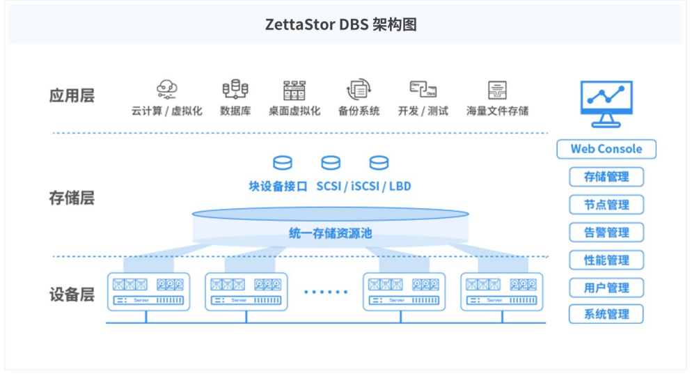 ZettaStor DBS是根据分布式块设备的特性,即高性能、低延迟和高可靠性等,专门设计的架构。提供对各个服务器内置硬盘资源的统一管理,构建一个统一的存储资源池,再从资源池中划分存储资源,以逻辑卷的形式提供存储资源。分布式存储软件负责分布式数据的处理,并保证存储服务的高可靠和高可用。