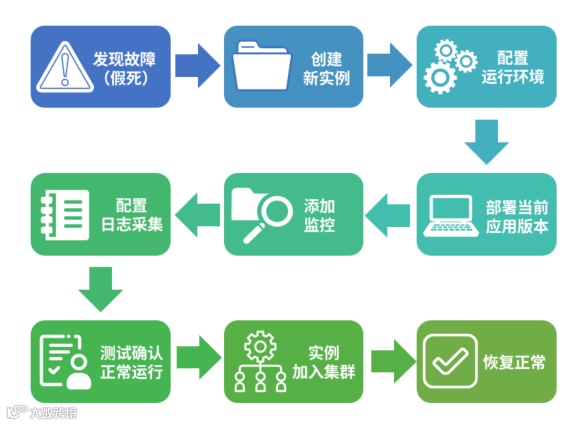 场景1: 在应用服务器发生故障时,如何在生产环境中,恢复一台Web应用服务器?如下图所示,实现恢复需要逐一完成发现故障、创建新实例、配置运行环境、部署当前应用版本、添加监控、配置日志采集、测试确认正常运行、实例加入集群以及恢复正常等9个步骤。